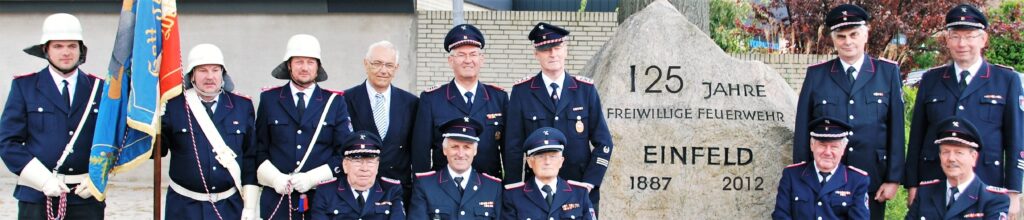 Im Jahr 2012 feierte die Freiwillige Feuerwehr (FF) Einfeld ihr 125-jähriges Bestehen. Offizielle Empfänge und einige sportive Kameradschaftstreffen mit Mitgliedern anderer Wehren waren fast das ganze Jahr über im Stadtteilteil zu sehen. Bei der Fotosession von Material und Personal fiel dem Aussenstehendem die Gruppe mit den „älteren“ Herren in Uniform auf, die besonders hofiert wurden … die Ehrenabteilung der FF Einfeld. Das Titelbild zeigt diese im Jahr 2012 und der Stein wurde digital „bearbeitet“.