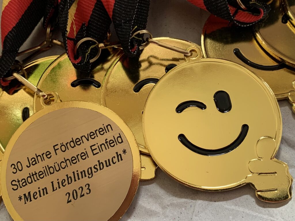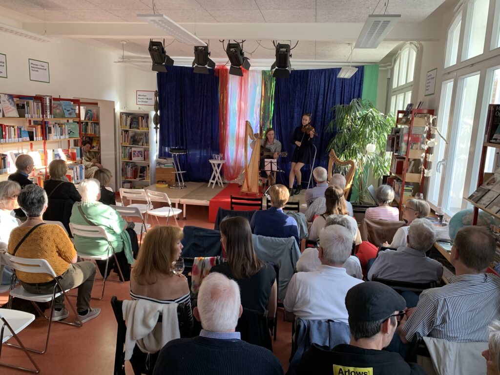 Ergänzt wurde diese Ausstellung durch Fotos von Schülerinnen und Schülern der Grund- und Gemeinschaftsschule (G-G-S) Einfeld mit ihrem Lieblingsbuch. Alle teilnehmenden Kinder erhielten einen Gutschein und eine Erinnerungsmedaille. Am Abend gab es eine geschlossene Veranstaltung für die Mitglieder des Vereins. Das Programm gestaltete die bekannte Erzählkünstlerin Susanne Ulke, die schon häufig in Einfeld zu Gast war. Musikalisch umrahmt und begleitet wurde die Lesung von dem Duo „Corda Amabile“. Den Ausklang des Abends bildeten nette Gespräche bei Schnittchen und einem (oder zwei) Gläschen.