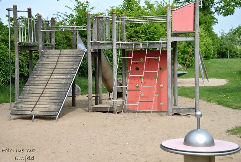 Am 14. Juni 2012 hatten wieder die Kinder und Jugendlichen bis 14 Jahre im Stadtteil Einfeld das Wort. Fast fünfzehn Kinder und Kleinkinder brachten ihre Eltern mit und versammelten sich am „Beduinenzelt“ im Neubaugebiet am Stoverbergskamp zwecks Mitsprache. Delia Winkler und Heiner Feilke von der Stadt Neumünster ließen die Kinder zu Wort kommen. Es ging um die Planung für einen neuen Spielplatz. Bisher gab es zwölf öffentliche Spielplätze in Einfeld bei über 70 im gesamten Stadtgebiet. Wenn man an spielende Kinder in Einfeld so 50 bis 60 Jahre zurückdenkt, so sieht man keine Spielplätze mit unterschiedlichen Spielgeräten wie wir sie heute kennen. Mit sehr viel Einfallsreichtum wurde das Spielen bereichert. Es wurde in den Knicks, auf den Straßen, auf den Feldern und im Einfelder Wald, dem Bondenholz, gespielt. Ein Projekt der Einfelder Grundschule aus dem Jahr 2007 berichtet nach Recherchen und Befragungen von Zeitzeugen ausführlich darüber und gewann bei einem Wettbewerb sogar einen Preis. Schaut man in die Protokolle der Beiratssitzungen, so findet man einige „Highlights“ nach der Eingemeindung, wie zum Beispiel im Jahr 1977. Im Rahmen der Bebauung des ehemaligen Butenschönschen Geländes im Bereich Carsten-Heeschen- und Karl-Feldmann-Straße plante die Stadt Neumünster einen Spielplatz. Der Beirat und die Anwohner hielten aber die Freifläche für ungeeignet, da dort zu wenig Kinder wohnten. Zeitgleich erfolgte der Ankauf des ehemaligen Postgebäudes in der Dorfstraße für Jugendzwecke und die Einrichtung einer Planstelle für eine hauptamtliche Betreuungskraft. Aber die Einfelder wollten mehr. Der Neumünsteraner Bürgermeister Sawade erwiderte die Forderung nach einer zweiten Kraft wie folgt: „Die Forderung nach Einstellung einer weiteren hauptamtlichen Betreuungskraft für einen Spielplatz, wie dies während der Sommerferien als ausgesprochene Ferienbetreuung für einen kurzfristigen Zeitraum möglich ist, kann während der übrigen Zeit nicht durchgeführt werden. Kinder und Jugendliche haben hier die Möglichkeit, die Einrichtung des Bezirksjugendheimes Einfeld zu nutzen.“ Anfang der 80er Jahre versuchte der Beirat Haushaltsmittel für einen Spielplatz am Einfelder See zu erhalten. Erst am 24.05.83 wird berichtet, dass DM 15.000 bereitgestellt wurden für den Ankauf von Spielgeräten im Bereich von „Zweibrücken“. Finanzielle Nöte führten auch dazu, dass bei der Fortschreibung des Spielplatzkonzeptes im Jahr 1996 heftig um die „Öffnung der Schulhöfe“ in den Nachmittagsstunden gestritten wurde. Der Einfelder Beirat und die Schulen lehnten es ab. Zu jener Zeit gab es über 60 Spielplätze im gesamten Stadtgebiet. Heiße Diskussionen gab es im Mai 2007, als die Stadt Neumünster das Bolzen auf dem ehemaligen Sportplatz am Kreuzkamp untersagte. Nachdem sich Vertreter der Verwaltung mit betroffenen Anwohnern, Kindern und Jugendlichen sowie deren Eltern an „einen Tisch gesetzt“ hatten, kam man zu einer einvernehmlichen Lösung, mit der alle zufrieden waren. Im Jahr 2009 führte der Holsteinsche Courier mit einigen Kindern einen Spielplatz-Test durch. Von den elf besuchten Plätzen war auch der Einfelder „Flaadenweg“ mit dabei. Er war der größte im Stadtgebiet, erhielt aber von den jugendlichen Testern keine Bestnoten. Die Verantwortlichen im Rathaus nahmen die Anregungen auf und reagierten prompt. So wurde auf dem Einfelder Spielplatz an der Dorfbucht umgehend „nachgebessert“.Parallel dazu wurden im gleichen Jahr die Einfelder Spielplätze den Eltern „ans Herz gelegt“. Das Familienzentrum Kita Einfeld führte in 2009 die Spielplatzaktion „Wie viel Bewegung braucht mein Kind“ mit großer Resonanz durch. Dabei wurden Ideen und Impulse für einen Spielplatzbesuch gegeben. Mit einem beladenen Bollerwagen ging es wöchentlich wechselnd zu den Einfelder Spielplätzen, um dort nach einem kleinen Picknick alte und neue Spiele gemeinsam zu testen. Betrachten wir im Jahr 2012 die zwölf öffentlichen Spielplätze (Verlinkung) im Stadtteil Einfeld, so kann sagen, dass sie richtig platziert sind. Sie sind nach unterschiedlichen Themen aufgestellt worden und werden wöchentlich unter dem Aspekt „Sicherheit“ von der Stadt Neumünster kontrolliert. Jährlich obliegt es dem TÜV, die Sicherheit auf den öffentlichen Spielplätzen zu überwachen.