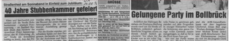 Das größte Straßenfest organisierte die SG Bollbrück am 10. Juli 1993. Von morgens bis spät in die Nacht wurde mit vielen Gästen gefeiert. Die Kinderrallye mit insgesamt zehn Spielen und knapp 2.500 Preisen war ein großer Höhepunkt. Knapp 200 Kinder rasten durch die Straße und Biggi und Karen hatten bei der Auswertung eine Menge zu rechnen. Ein Erlös in Höhe von 3.600 DM konnte an verschiedene Projekte in Einfeld gespendet werden. Die eigene, kleine Party feierten die Bollbrücker am darauffolgenden Tag.